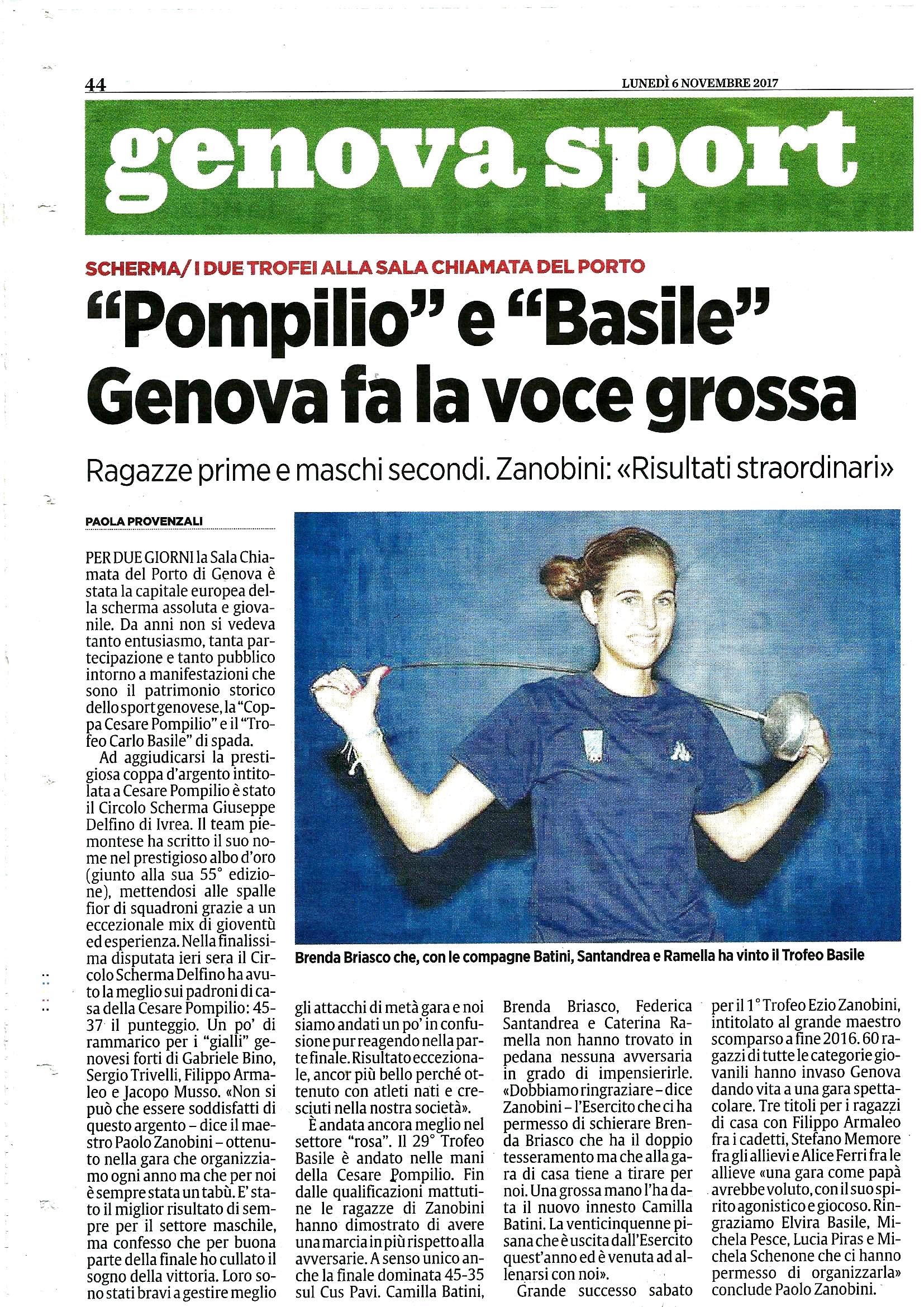 PER DUE GIORNI la Sala Chia-mata del Porto di Genova è stata la capitale europea del-la scherma assoluta e giovanile. Da anni non si vedeva tanto entusiasmo, tanta par-tecipazione e tanto pubblico intorno a manifestazioni che sono il patrimonio storico dello sportgenovese, la "Coppa Cesare Pompilio" e il "Trofeo Carlo Basile" di spada. Ad aggiudicarsi la prestigiosa coppa d'argento intitolata a Cesare Pompilio è stato il Circolo Scherma Giuseppe Delfino di Ivrea. Il team piemontese ha scritto il suo nome nel prestigioso albo d'oro (giunto alla sua 55° edizione), mettendosi alle spalle fior di squadroni grazie a un eccezionale mix di gioventù ed esperienza. Nella finalissima disputata ieri sera il Circolo Scherma Delfino ha avu-to la meglio sui padroni di casa della Cesare Pompilio: 45-37 il punteggio. Un po' di rammarico per i "gialli" genovesi forti di Gabriele Bino, Sergio Trivelli, Filippo Arma-leo e Jacopo Musso. «Non si può che essere soddisfatti di questo argento - dice il maestro Paolo Zanobini - ottenuto nella gara che organizziamo ogni anno ma che per noi è sempre stata un tabù. E' stato il miglior risultato di sem-pre per il settore maschile, ma confesso che per buona parte della finale ho cullato il sogno della vittoria. Loro sono stati bravi a gestire meglio
