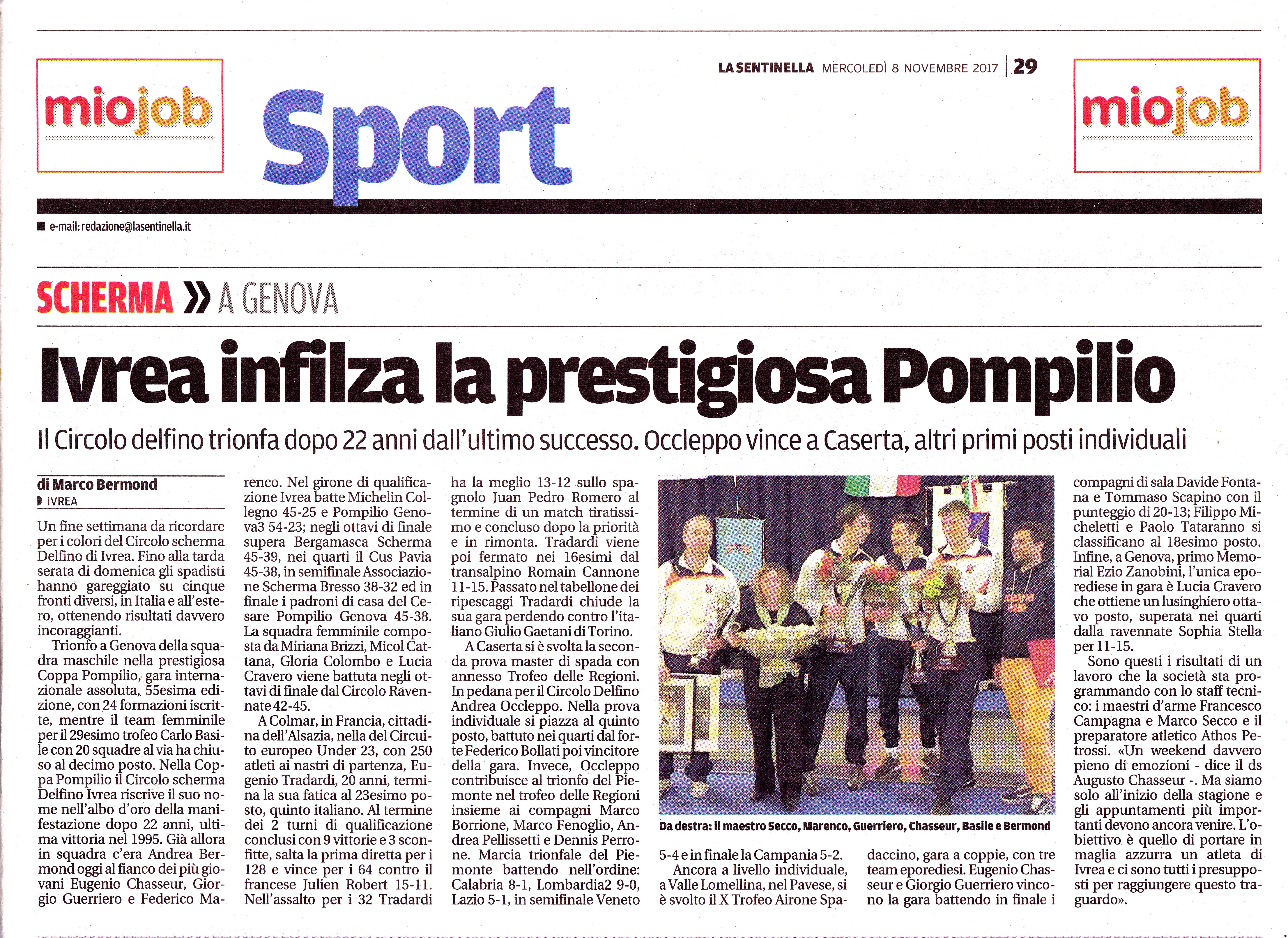 Un fine settimana da ricordare per i colori del Circolo scherma Delfino di Ivrea. Fino alla tarda serata di domenica gli spadisti hanno gareggiato su cinque fronti diversi, in Italia e all'este-ro, ottenendo risultati davvero incoraggianti. Trionfo a Genova della squa-dra maschile nella prestigiosa Coppa Pompilio, gara interna-zionale assoluta,. 55esima edi-zione, con 24 formazioni iscrit-te, mentre il team femminile per i129esimo trofeo Carlo Basi-le con 20 squadre al via ha chiuso al decimo posto. Nella Cop-pa Pompilio il Circolo scherma Delfino Ivrea riscrive il suo no-me nell'albo d'oro della mani-festazione dopo 22 anni, ulti-ma vittoria nel 1995. Già allora in squadra c'era Andrea Ber-mond oggi al fianco dei più gio-vani Eugenio Chasseur, Giorgio Guerriero e Federico Ma-